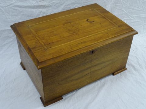 A 19th CENTURY SWISS CYLINDER MUSIC BOX with 16 cms brass cylinder and bells in view playing twelve airs, the bell strikes fashioned as butterflies, the lid with interior tune card, 22.5 cms high, 42.5 cms wide, 28.5 cms deep