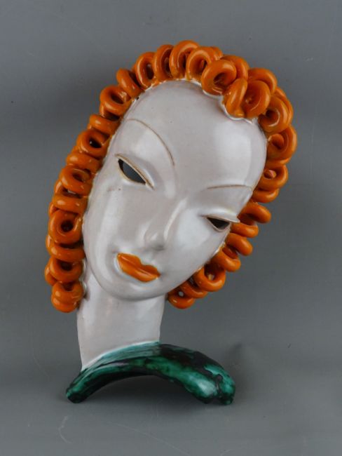 A GOLDSCHEIDER OF AUSTRIA CERAMIC WALL MASK, incised no. 6427 with manufacturer's backstamps, 27 cms