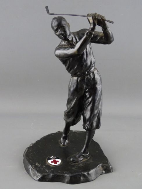 A VINTAGE CAST METAL FIGURE OF A GOLFER, the base set with an oval enamel plaque showing the emblems for the Red Cross and St John's Order, the rear with indistinct impressed marks, 23.5 cms high