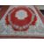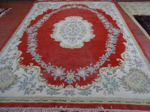 A CHINESE WASHED WOOLLEN CARPET, predominantly red ground with central floral motif and bordered edges, 365 x 275 cms approximately