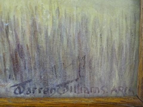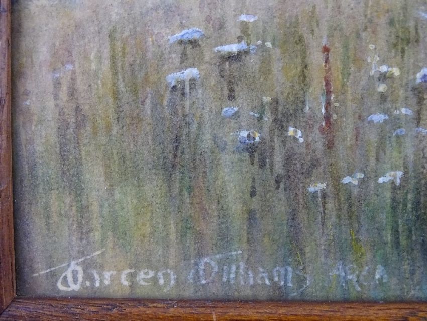 WARREN WILLIAMS ARCA watercolours, a pair - farmers harvesting at bends in the River Conwy, near Glan Conwy, both signed, unmounted and with original frames, 23.5 x 37 cms