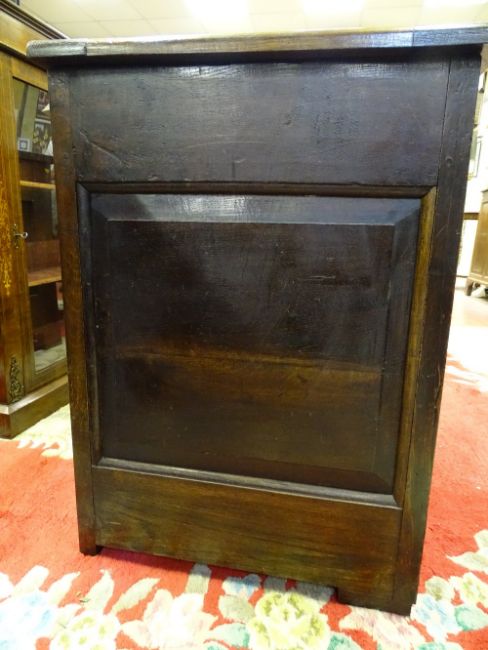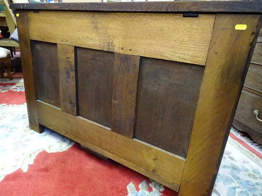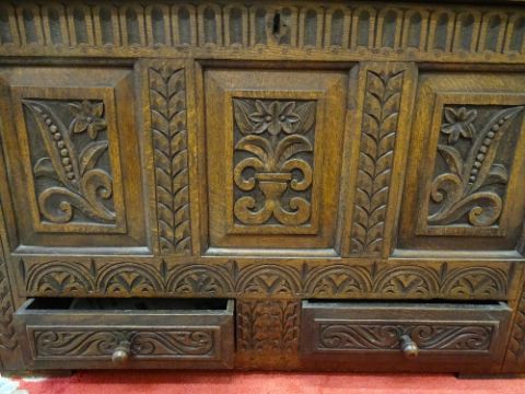 AN ANTIQUE STYLE CARVED OAK MULE CHEST with triple floral carved front panels and two lower drawers, 73 cms high, 114 cms wide, 53 cms deep