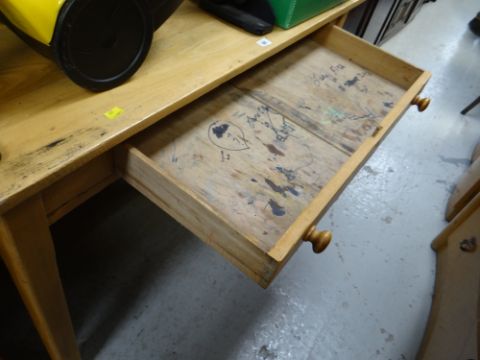 A lightwood school desk with drawer (profusely graffitied by former pupils)