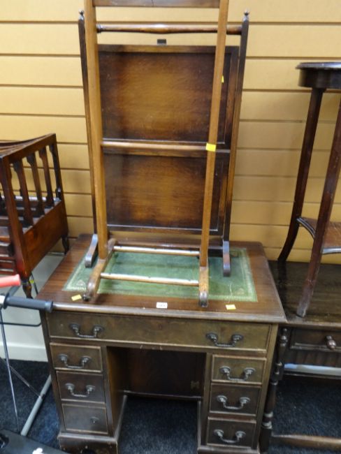 A compact kneehole desk with tooled green leather top together with a jacket suit stand & fire screen / cake stand
