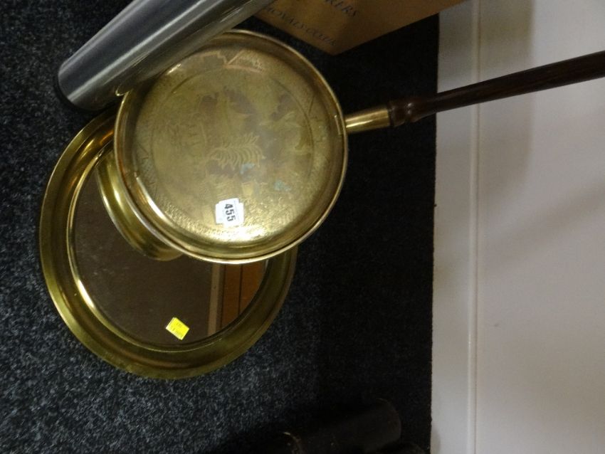 A small brass circular mirror together with a brass bed warming pan