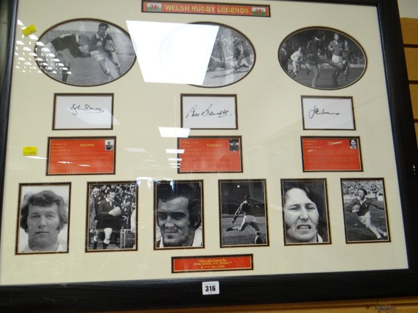 A framed Welsh rugby legends autograph display with signatures from JOHN DAWES, PHIL BENNETT & J P R WILLIAMS
