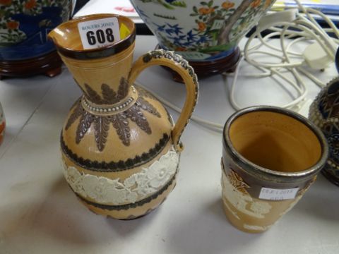 A Doulton Lambeth floral applied jug & similar silver rimmed hunting beaker