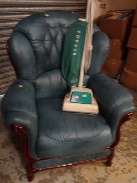 A modern blue leather & dark wood framed wingback scroll-top armchair together with a vintage Hoover vacuum cleaner