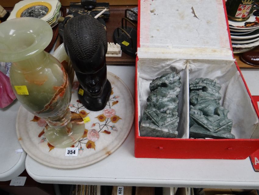 A pair of tourist ware lion dog ornaments, an onyx vase, African bust, mineral specimen dish & other similar items