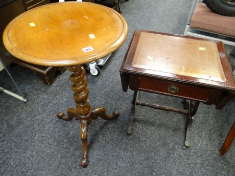 An antique barley-twist tripod table & a reproduction drop flap single-drawer table