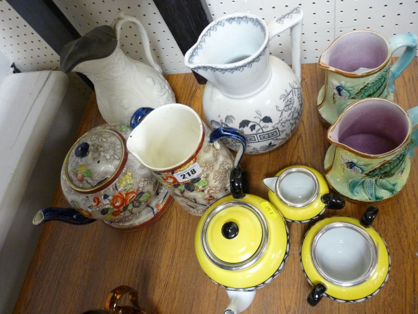 Three piece yellow and black pottery tea service, two Majolica type jugs, a pewter lidded jug etc