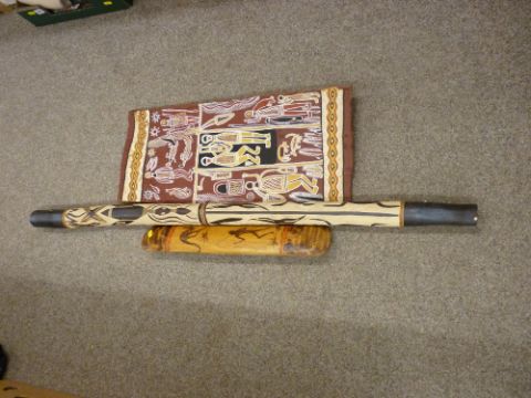 Three modern Australian Aborigine decorated items including a didgeridoo, decorative panel and a hand shield