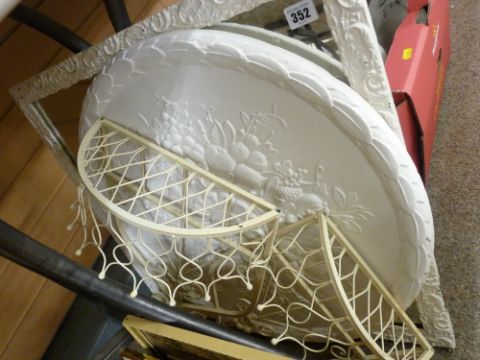 Painted frame wall mirror, two wirework shelves, plaster ceiling rose etc
