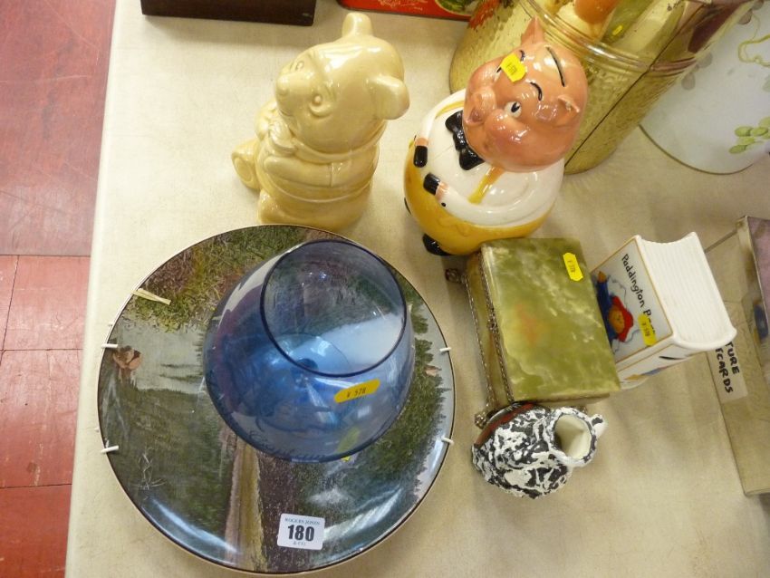 Two Royal Doulton Canadian scene plates, two pottery moneybox pigs, a Paddington Bear moneybox and a small onyx lidded box etc