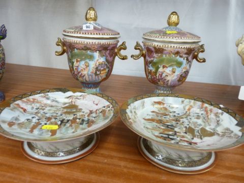 Pair of Oriental reproduction twin handled vases with covers and a pair of Satsuma figural pedestal stands (chip to rim of one)