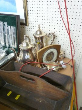 Treen two compartment cutlery box, a four piece electroplated tea and coffee service and a small electric clock