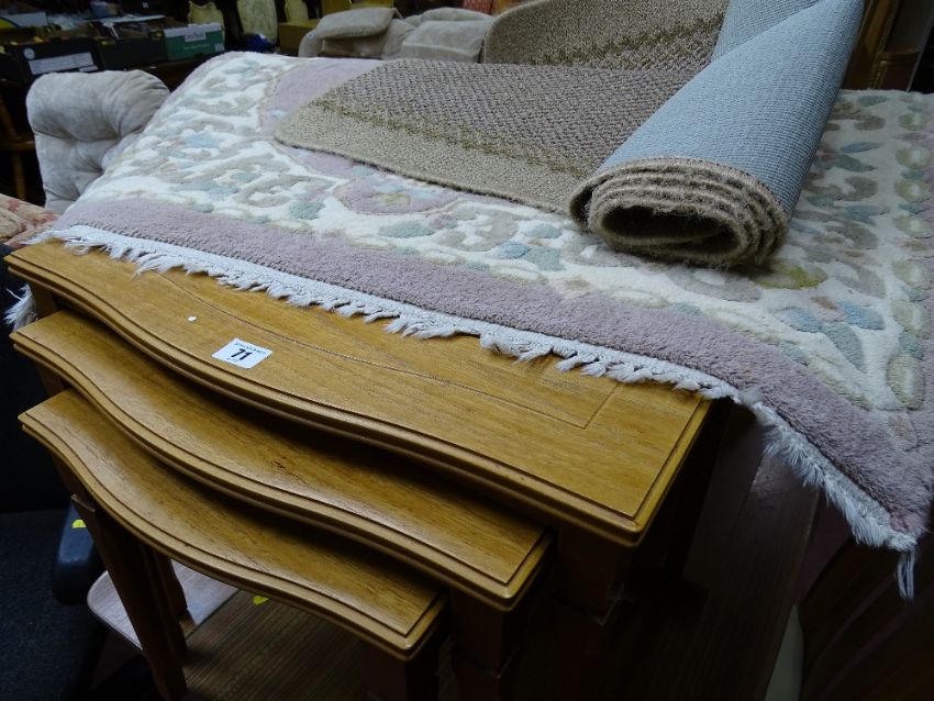 Modern nest of three tables, a melamine wood effect three shelf small coffee table and a small Chinese washed rug along with one other
