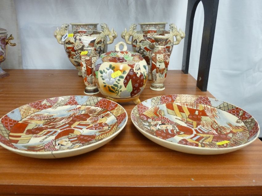 Pair of early 20th Century Satsuma vases on three supports with dragon handles, a pair of small Satsuma vases (damage to one), a pair of Satsuma circular plates (damage to one) and a lidded bowl of similar style and period