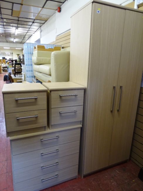Modern light wood four piece bedroom set of two door wardrobe, four drawer chest and twin two drawer bedside chests