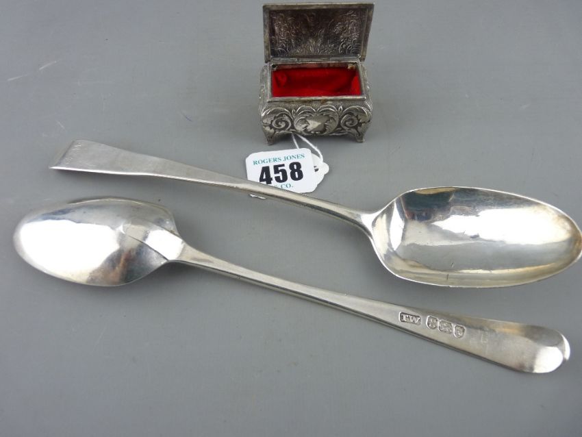 Pair of George III silver serving spoons, London 1782, 'T W' maker's mark and a small white metal lidded box