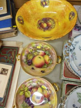 Pair of circular china pedestal fruit bowls with twin gilt handles depicting apples and blackberries on one and pears and blackberries on the other, each signed by the artist Budd and a large oval fruit decorated basin