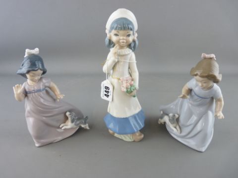 Two Nao figurines of young girls playing with puppies and one other