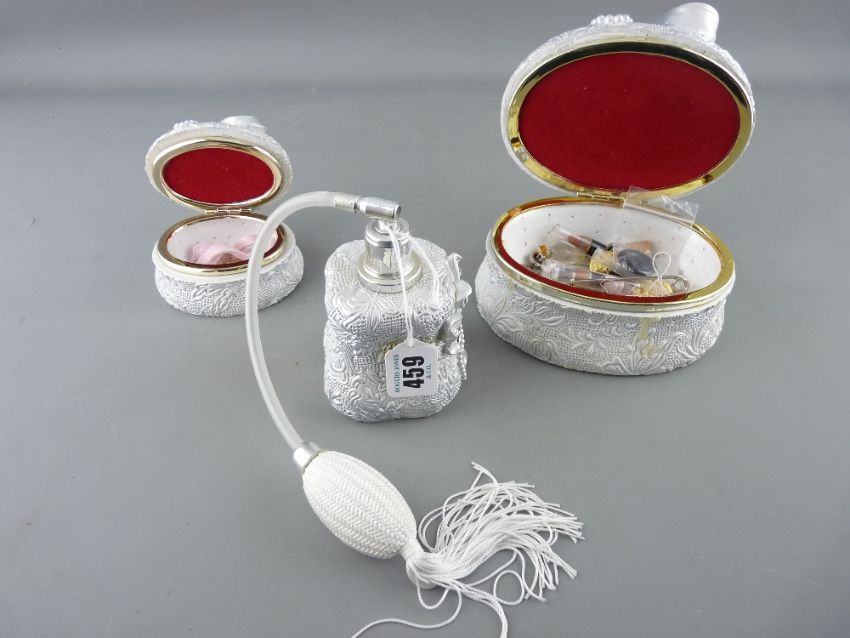 Three piece bow decorated composition dressing table set, two lidded boxes and contents and a scent bottle