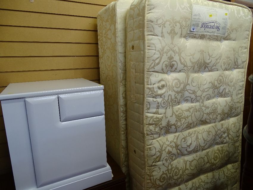 Sleep Vendor single divan bed with storage drawers and a white painted bedside cabinet