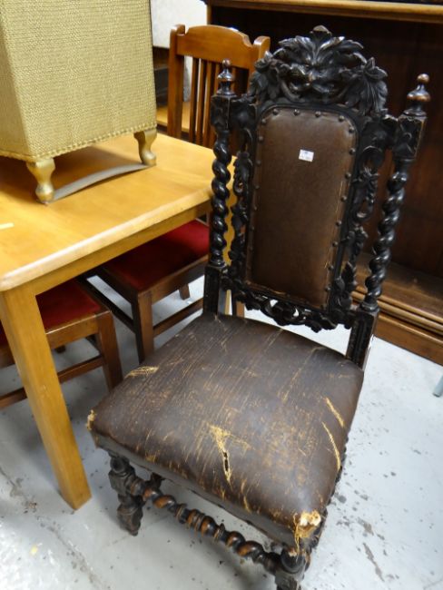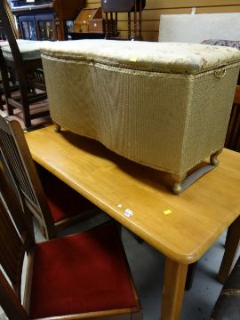 A vintage Lloyd Loom serpentine linen basket, an antique carved chair & a modern table & four chairs