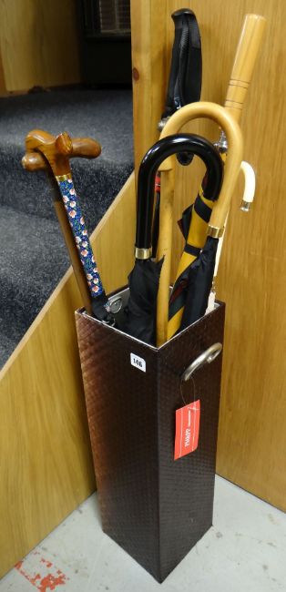 A modern wicker effect double-handled stick stand together with contents of umbrellas & walking sticks, one with a hallmarked silver top