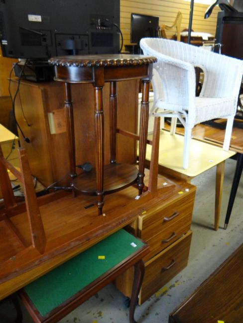 A retro Formica top kitchen table, a loom chair & a reproduction occasional table, a Vanson Long John coffee table etc