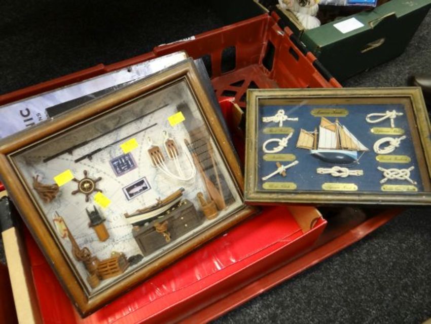 Two framed displays of nautical knots, Titanic ephemera & a Little Britain doll together with a parcel of mixed china