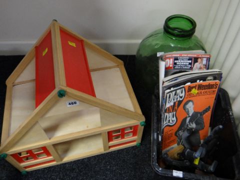 A small child's doll's house together with green glass terrarium & several magazines etc