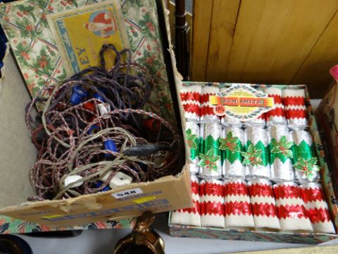 Boxed vintage Christmas crackers & Christmas tree lights, Guinness barometer etc