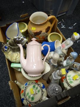Two crates of mixed china including continental figurines, selection of LP & single records etc