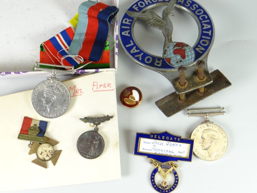 A vintage Royal Air Forces Association car grill badge, two WWII medals etc