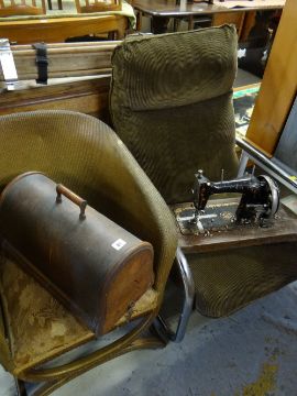 A retro chrome framed corduroy chair, a loom chair & a vintage Singer sewing machine