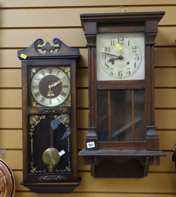 A vintage Vienna-style oak cased wall clock together with a modern wall clock
