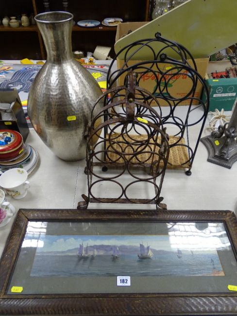 Oak framed Oriental oil on panel of boats, character marked lower right, two vintage style wine bottle racks and a bulbous metal vase