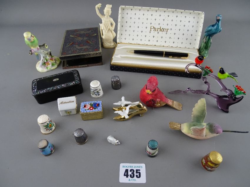 Group of collectables including enamelled and silver thimbles, papier mache snuff box, an Indian white metal cigarette case etc