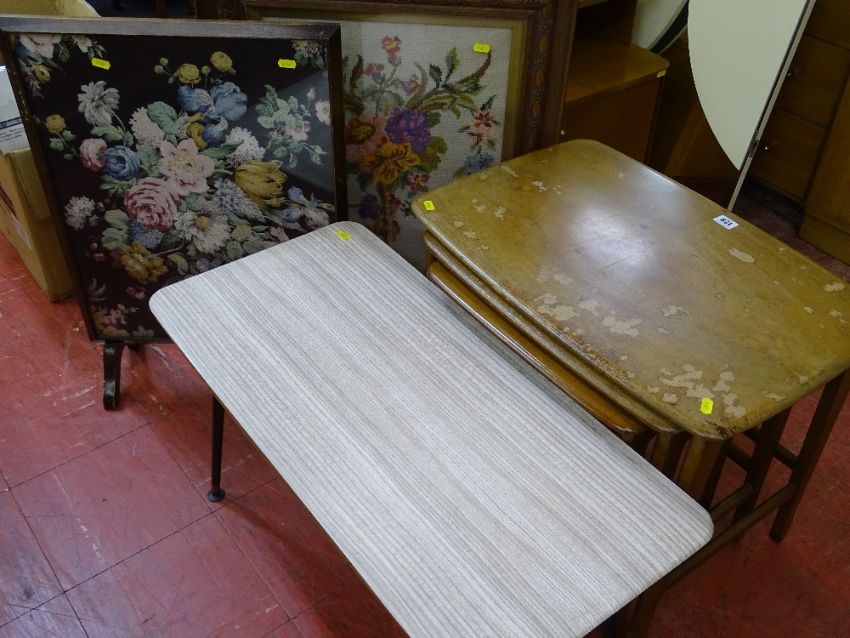 Mid Century Remploy nest of three tables, a small retro coffee table and two floral design firescreens