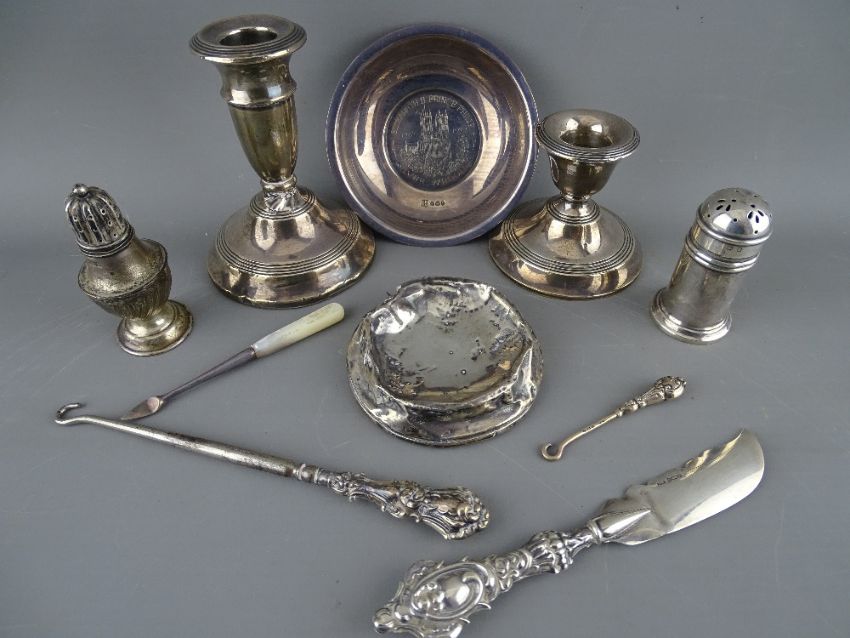 Small silver (a quantity) including a commemorative bowl, condiment items, squat candlesticks, letter opener, butter knife etc