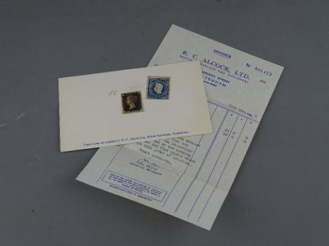 Penny Black postage stamp and one other, the plate 5 Penny Black with four borders and cancellation in red