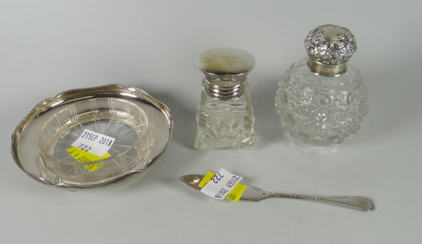 Two hallmarked silver topped dressing table bottles together with a hallmarked silver glass bottomed butter dish & knife
