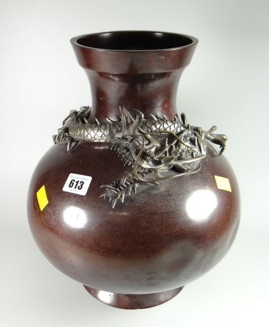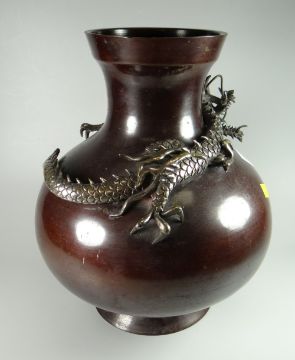 A large circular Japanese bronze vase decorated with a stylized dragon