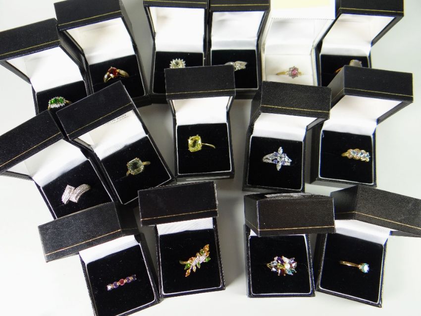 Sixteen dress rings in boxes together with a small diamond cluster & including green quartz, moonstone etc
