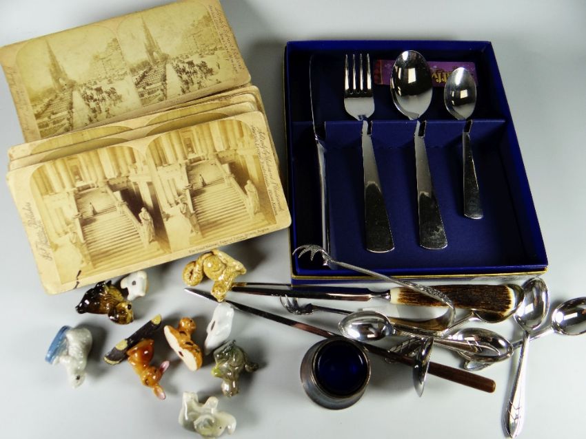 A box containing Wade Whimsies, old postcards & various EPNS cutlery