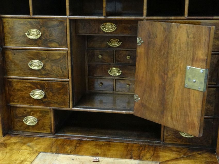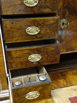 Condition: front panel of cupboard has splits in an almost H design, dry in places with splits & chippings to rims, top right part of cornice is loose, veneer bubbling & losses throughout, interior drawer configuration again has splits, adjustable writing slope surface is tired & dry with ratched mechanism behind partially broken (there is a key available).