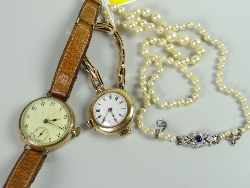 Two ladies' yellow metal watches, one hallmarked 9ct together with a single strand of pearls with coloured stone decorated clasp