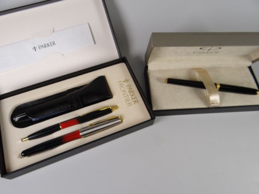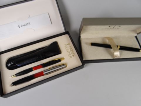 Modern boxed black & red Parker Frontier fountain pen & ballpoint pen set with leather pouch & a modern boxed (1990s) black Parker 75 Premier fountain pen with 18k nib
